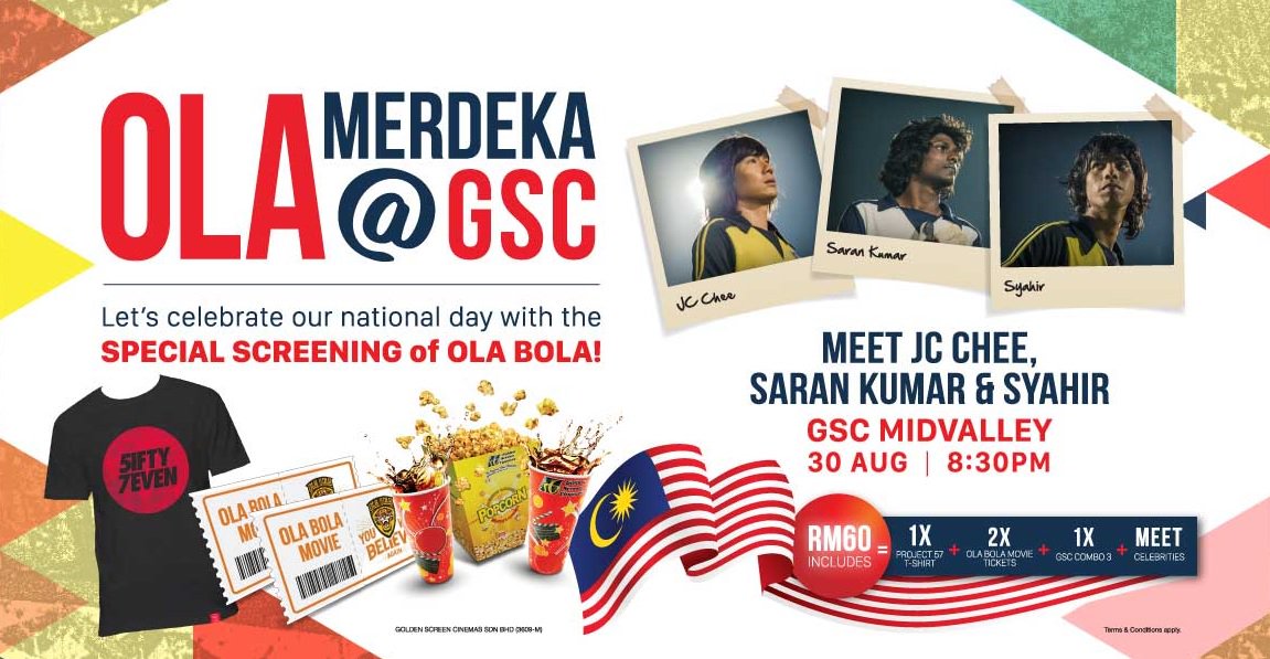 Daripada GSC pula adalah peluang untuk berjumpa dengan para pelakon yang terlibat dalam filem Ola Bola antaranya JC Chee, Saran Kumar dan Syahir. Dengan harga RM60, ianya merangkumi dua tiket ke tayangan istimewa Ola Bola di GSC Midvalley pada 30 Ogos 2016, Produk 57 T-shirt, Popcorn kombo dan peluang menemui bintang filem ini.